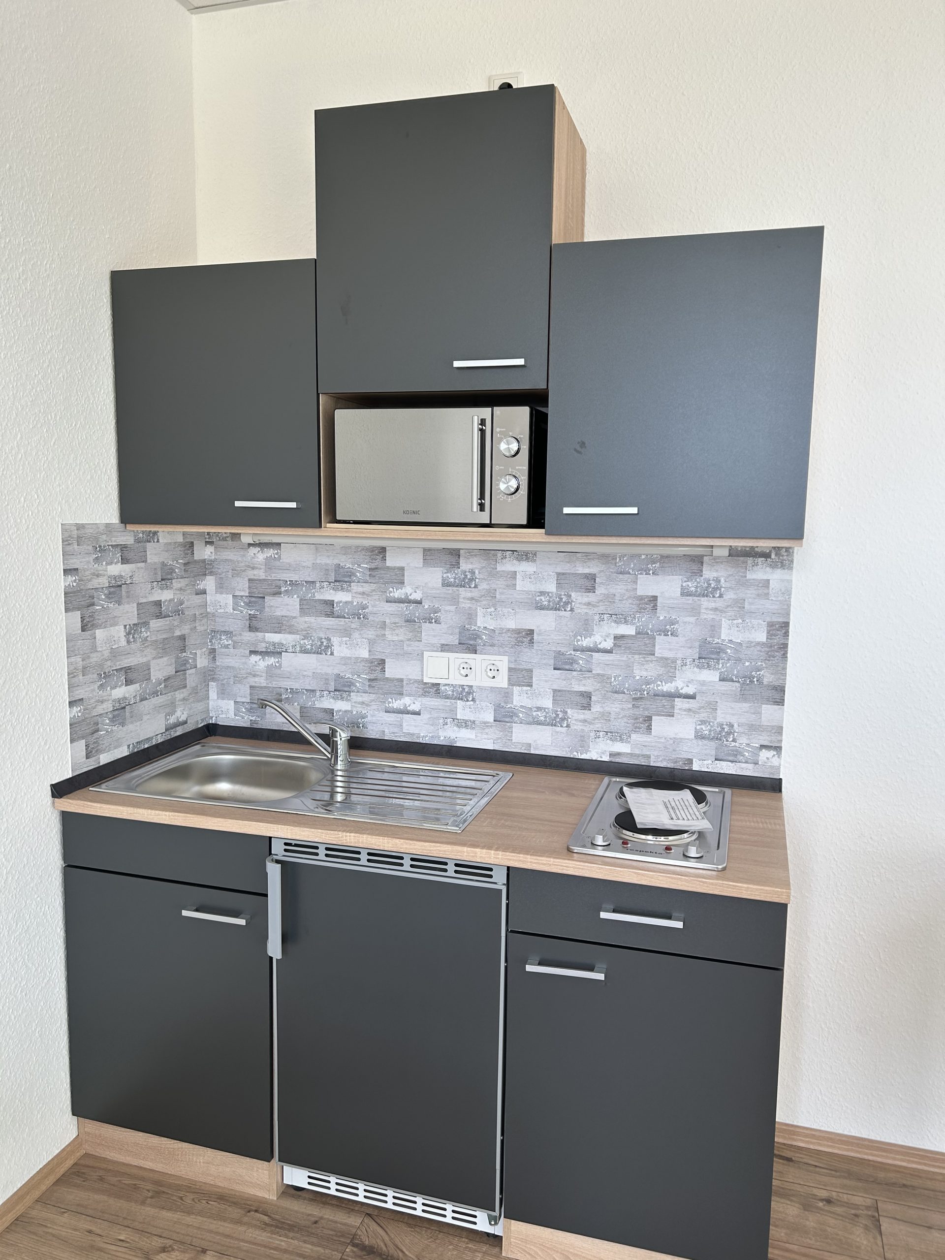 - Praktische Pantry-Küche mit Kochfeld, Kühlschrank, Mikrowelle und Spüle